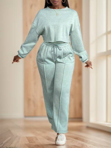 بدلة نسائية بتصميم عصري تشمل بلوزة فضفاضة بياقة دائرية وأكمام طويلة وبنطال واسع الأرجل