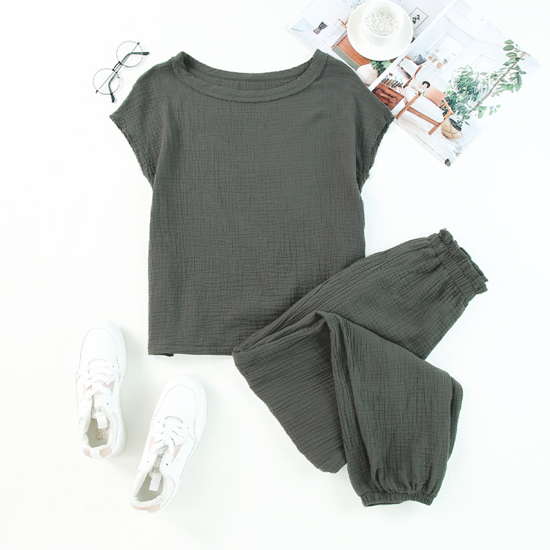 Color: Gray Pants length: trousers Fabric name: Cotton Sleeve type: batwing sleeve Main fabric composition: Cotton Applicable Gender: Female Sleeve length: quarter sleeve Size: S,M,L,XL