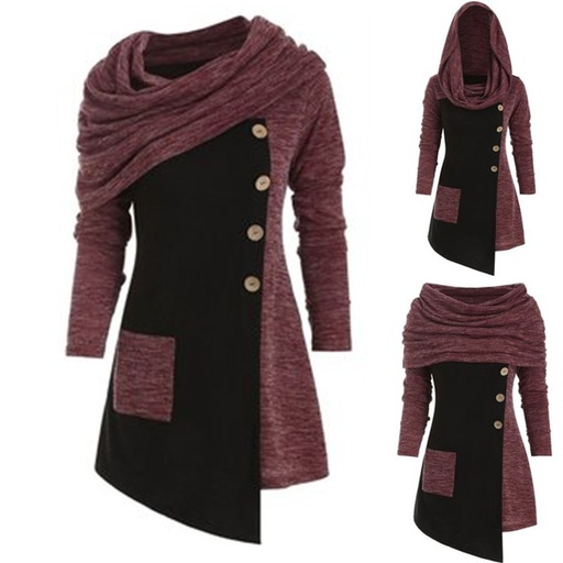 Women’s Blouse with Hood, Piled Collar, Button Decoration, and Stitching Detail