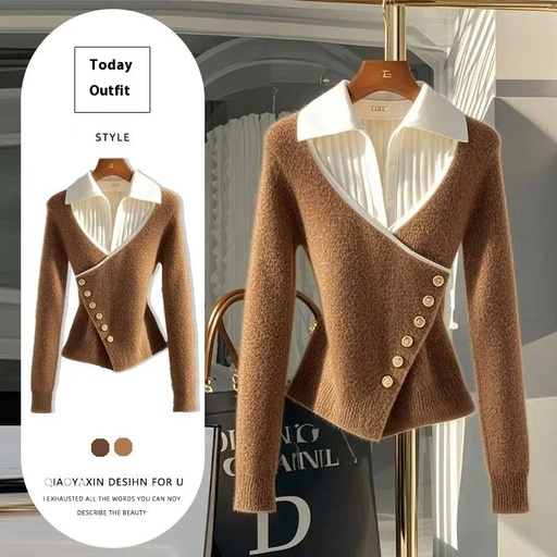 Knitted blouse with an irregular V-neck and fitted waist design, suitable for autumn and winter