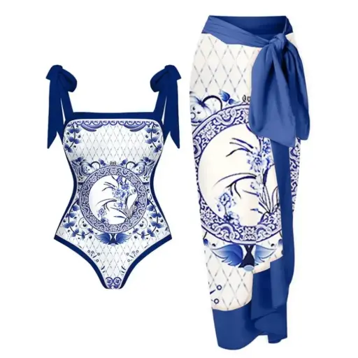 Two-piece swimsuit with a chiffon skirt and sun protection.