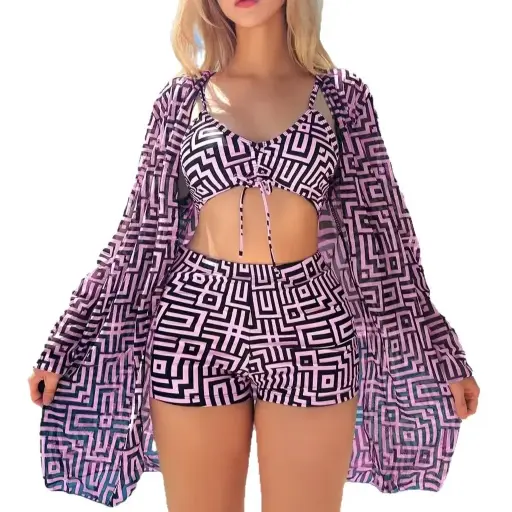 Three-piece swimsuit set with long sleeves.